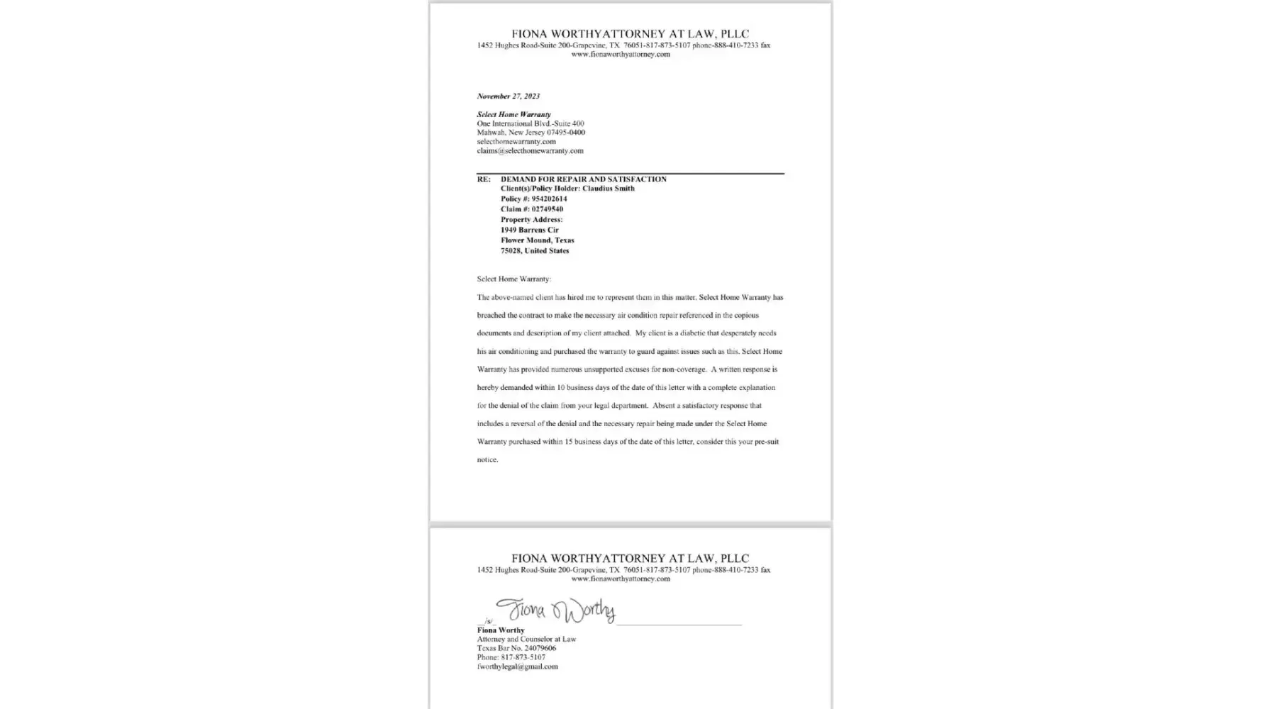 Desired outcome: A call from a Select Home Warranty with authority to discuss my situation and offer a valid claim payment for resolution.
