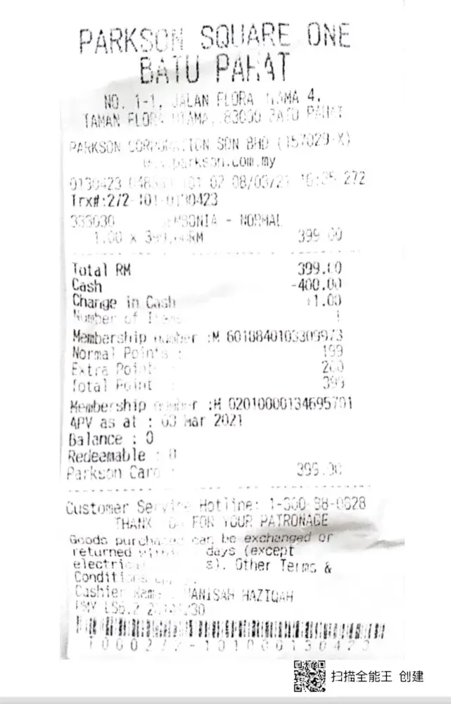On 8/8/2018, I purchased a handbag (Article [protected]) from Parkson Mahkota, Purchase outlet is CG660.