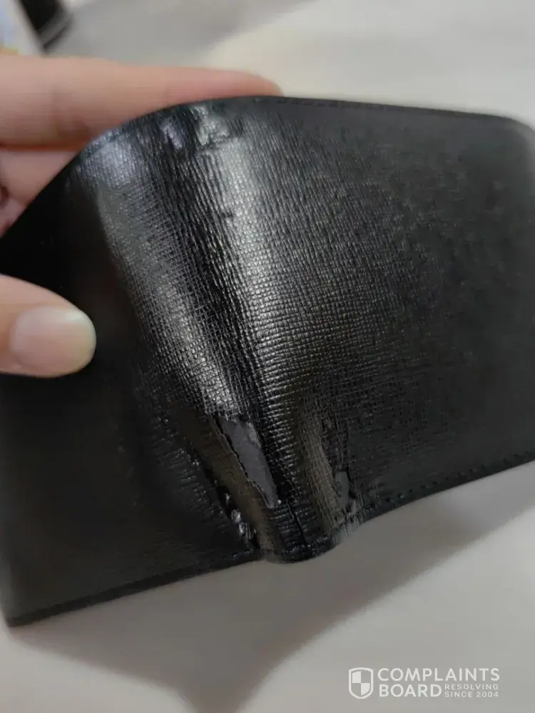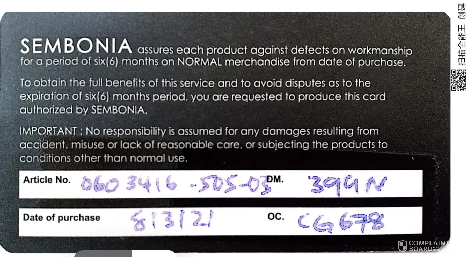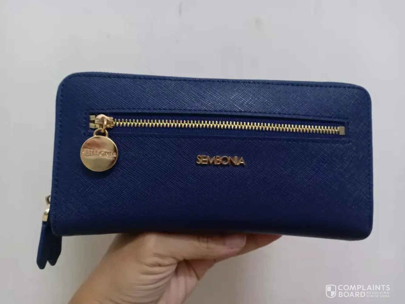 My sister-in-law bought her first Sembonia wallet on 8 Mar 2021 at Parkson Square One Batu Pahat. The navy skin was peel off or discolouration on few areas as per photo attached. She tried to sent it back to the promoter for repair but the promoter told her not cover under warranty. She ask her to file complaint to the HQ.