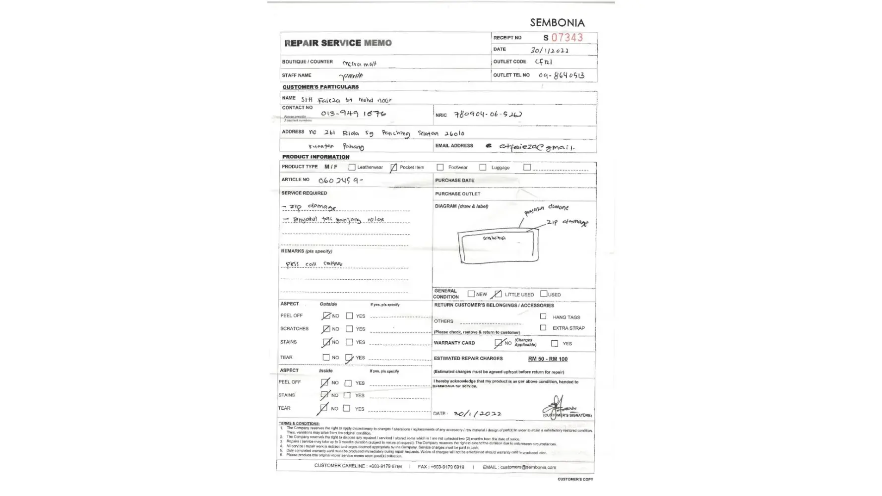 On 20/8/2018 I visited Parkson Mahkota to complain and was referred to your Sembonia Outlet CF51 Mahkota Parade Melaka. A, Ms. Poh attended to my complain and agreed to send my handbag sling with the broken hook for repair. I visited your outlet on 4/10/2018 afternoon around 3 p.m. and was informed that they have not received my handbag sling from your Company. The Malay salesperson informed me that I would be informed if my handbag sling reaches their outlet.