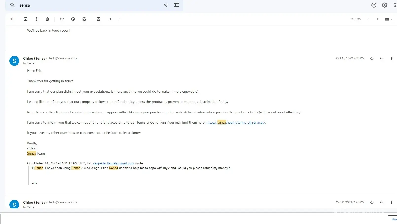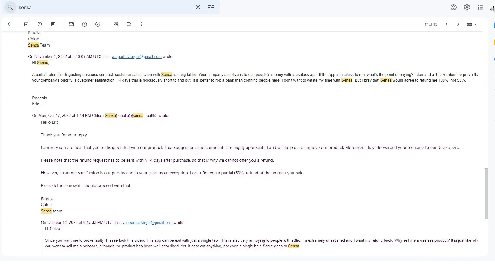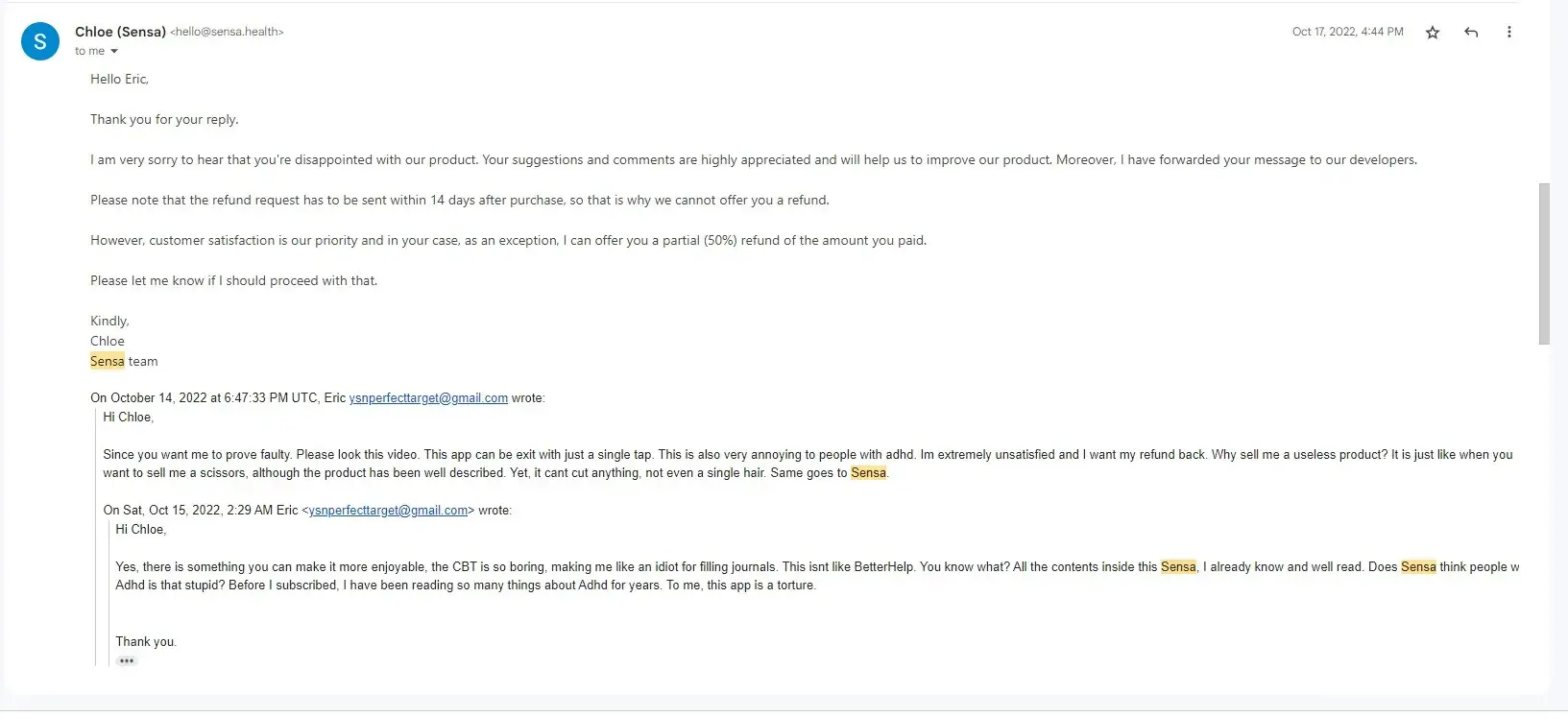 Please refer to this video, I sent a complaint to Sensa on 5 Oct 2022 but nothing changed. I submitted a refund request on 13 Oct, and Sensa responded on 14 Oct. Sensa actually works like this, Sensa will give you a lesson once every 24 hours(a day), a very basic lesson about managing anxiety and it's simple to Google search all about this kind of article and you will get the answer right away, it provides no value to the user at all, a useless CBT app. It is not only me who faced this problem, a lot of Adhd users from Google Play reviews mentioned it. It has a bug issue that causes the entire App to exit with an accidental tap on the back button, extremely irritating for Adhd people. It was very hard to determine whether Sensa will be able to fix it before 14 days or not since Sensa doesn't give enough time for trial and in order to get Sensa's assessment result, you will have to pay first, then only you can get it. Ended up that nothing is fixed even now. It is fair for me as the user to ask for a refund since the app is useless yet Sensa refused to fully refund but it could only agree to refund half of it. This triggers me a lot because it is unfair for users if the App is proven useless or ineffective. It is just like buying medicine, you bought it, you consumed it, and in the end, it was just a useless placebo. Then you lodge a complaint, saying that it is supposed to be a medicine yet it is a placebo, hence the case becomes a fraud. Please refer to the video or you can just subscribe to Sensa and you will know what I'm talking about.