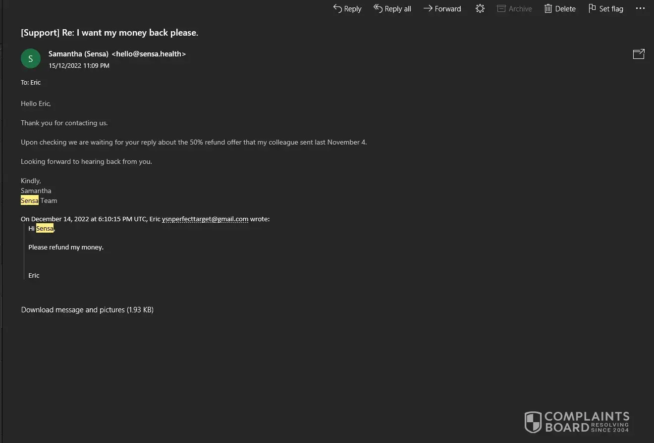 Desired outcome: I want a full and immediate refund and to have nothing more to do with Sensa.
