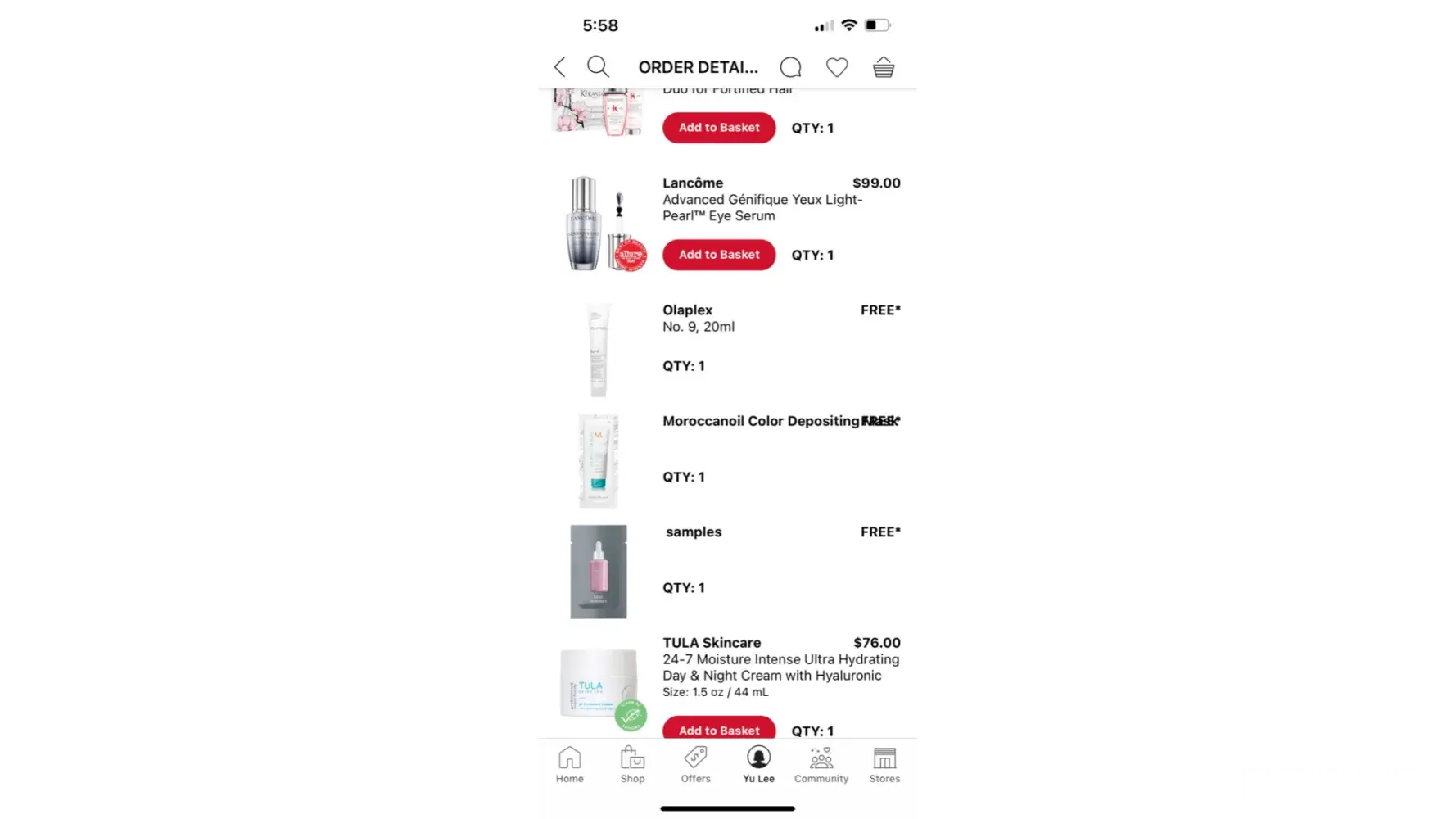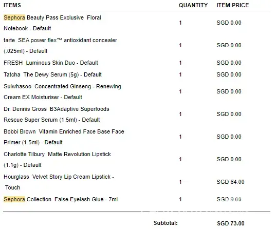 1. I had placed an order to purchase 2 items and redeemed some gifts (using my points and promo code), birthday gift and some samples on 1 January 2023. Total cost is S$73.00. I attach the list of items ordered for reference.