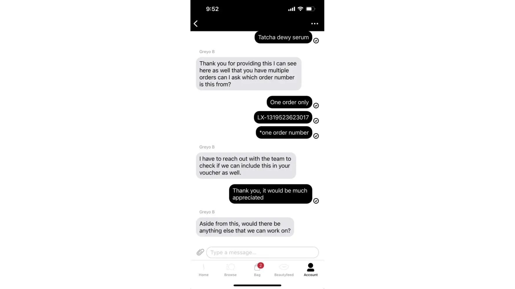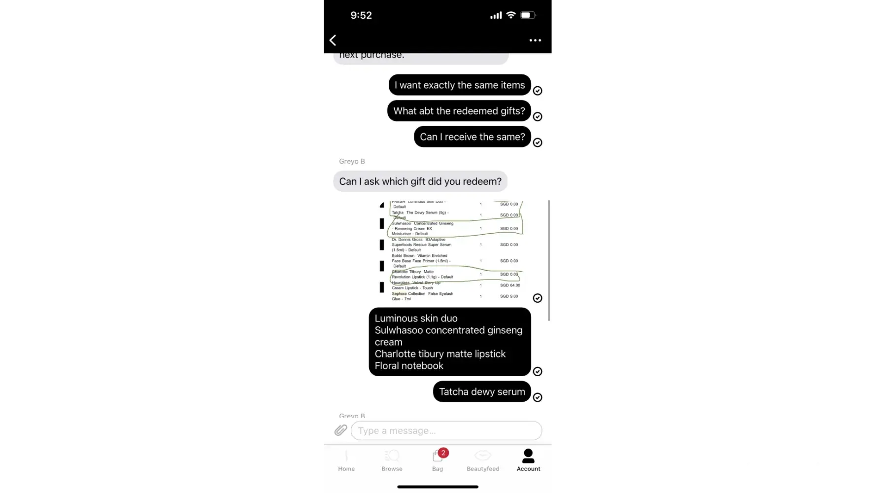 4. To ensure I can receive the items I previously ordered on 1 January 2023, I have contacted the customer service agent again. The agent, Greyo B replied that he/she has to check if Sephora can include the gifts which I have previously redeemed into my credit voucher. Correspondences (4th and 5thAttachments) are attached for your reference.