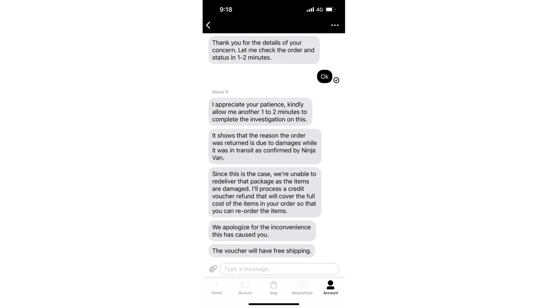 3. I contacted Sephora customer service agent via Live Chat yesterday (6 January 2023) morning. I understand from the agent, Mikee R that the reason the order was returned is due to damages while it was in transit as confirmed by Ninja Van. As such, Mikee R said Sephora will provide a Credit Voucher (S$73.00 including shipping fee) for me to re-order the items, although I have explicitly requested to re-send the items. I was told by Mikee R that Sephora is unable to re-send items from a completed order number. Correspondences (2nd and 3rd Attachments) are attached for your reference.