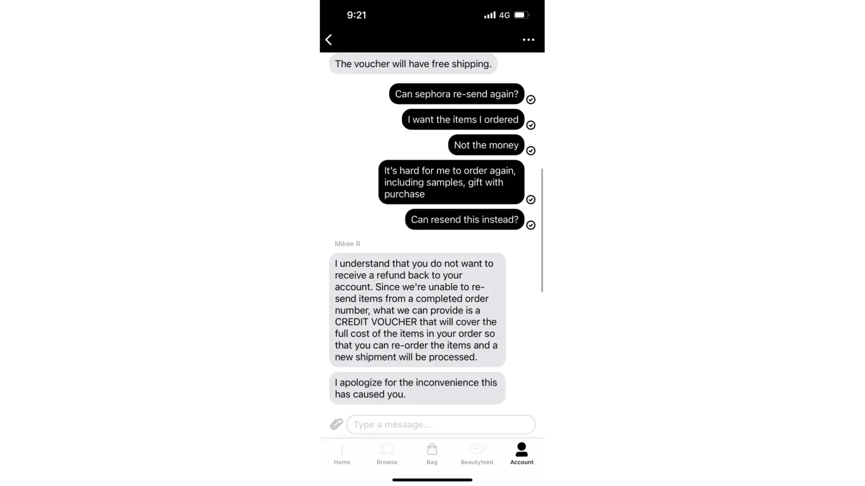 I expect Sephora to replace the items and re-send again, instead of requesting me to re-order again which is really inconvenient.