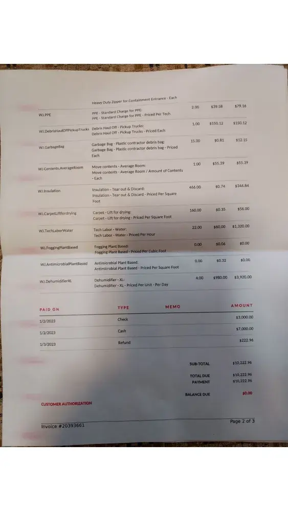 I contacted Servpro through my State Farm recommendation claim number 2543k937f on December 24th due to a upstairs bathroom pipe freezing and leaking. Servpro came out on the 26th to install equipment in the upstairs and downstairs bathrooms of an 1880s house. I explained to them that there was horsehair plaster and extra thick walls and they needed to really open it up to dry it, they cut a 2 inch by 4 in hole in the ceiling of the first floor hallway directly below the bathroom and then they sealed off the bathrooms upstairs and downstairs. When they came back on the 29th of December to check the water it was still high in the walls. They rewrapped to seal it better and said they'd leave the heaters to dry and the dehumidifier they came back out on the 23rd or 24th and said the upstairs was dry they removed the flooring and broke the wax ring on toilet. In the meantime I had called the Ozark office that was taking care of the issue and told them about the root cellar being wet I called them two times in 2 days. Then about then about 3 days later they showed up to pull all of the equipment without putting anything in the root cellar. I told them they needed to move those down to the roof Cellar cuz it was wet they did and I explained to them that it's because they didn't put enough hot air in upstairs to dry it out. So then it was another week of their equipment in my root cellar to dry what they didn't dry to start with. The people they sent had no clue of how to remediate the moisture a 2-in hole for three floors of house will not dry it out in 72 hours. I am not paying the balance of the Bill of $2,000 give plus or minus for damage and further continuing of wetness in my house because of their unability to properly prep the house for drying. The attach picture is the visible damage originally and where the light is, is where they cut the 2 in by 4-in hole that is the ceiling between the two bathrooms and to the side. The rest of the pictures are how much damage they had to remove once it was all dry and I believe that a lot of damage to the flooring in the kitchen and the damage to the root cellar was caused by lack of attention and knowledge on the part of the remediation team.