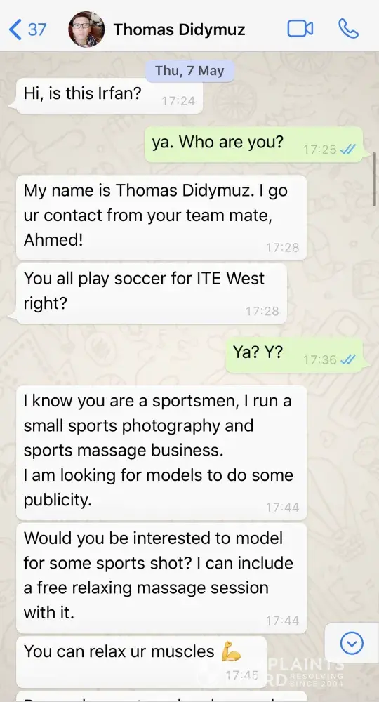 I would like to share what my 17 year old son received thru his WhatsApp instant messaging platform from a small home business owner called Thomas Didymuz, who supposedly runs a spa offering massage services. On 7 May 2020, my son received a message from Thomas Didymuz offering him a chance for paid assignments to review the spa services like what...