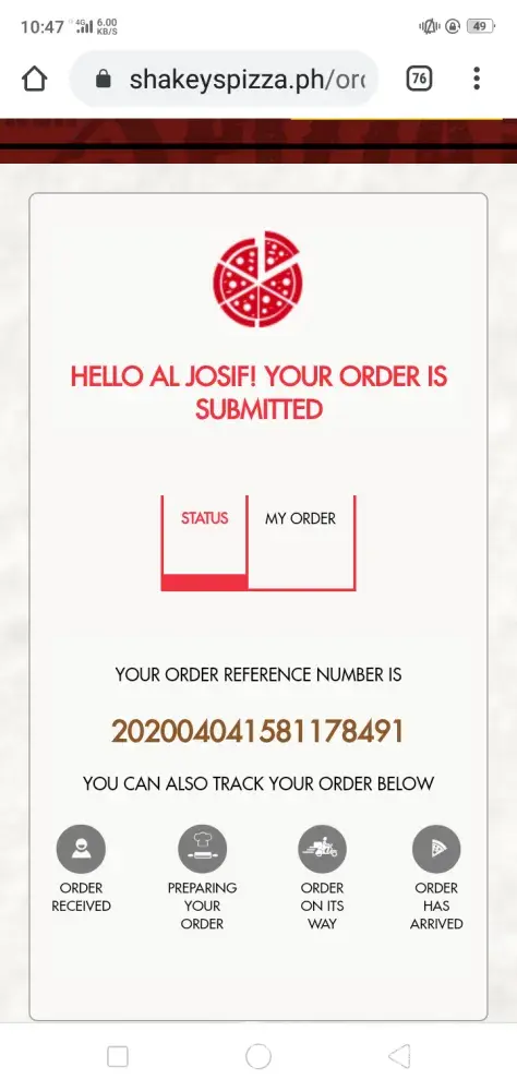 I ordered thru shakeys online delivery website and successfully placed order around 9:09am.. Dec 21, 2020... Reference number [protected] and paid it via credit card. It has been 2 hours now and havent received the order. I contacted customer service at #77777 and advised me that they dont see my order in system. Like what!?! It was a send a shakeys since I am giving it for healthworkers/frontliners and didnot received my order on time. It is the only time they will get to eat for break then was expecting for the delivery which didnt come on time.. It is very disappointing when it is my first time to use your website for delivery. I have not experience such with other delivery merchants. And after calling multiple times to your hotline which dont find my order, then I received a text message from shakeys at exactly 11:15am telling me that my order will arrive in 30mins. Like what?!?! Another 30mins