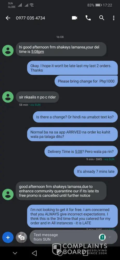 I want to complain about the service we received from the Shakeys Pizza in Nasugbu Branch. We order buy1take1 pizza online + coke + free managers choice pizza on May 15, 2022, at 3:04 PM. It shows in the app that we need to wait for 30minutes before the order arrives or if late, it's free. Then after 12minutes, they called saying that they couldn't deliver it right away with the time given and could only deliver within 45minutes. Without confirmation from us, I noticed that they already changed the minutes waiting to 45minutes in the app. I asked if the 12minutes of waiting can be deducted from the new time waiting of 45minutes, and they said no. We asked if the delivery place is too far (though we know it's not, it should be like 5-10minutes drive), and the one we talked to over the phone said, you can cancel the order. Without giving any valid reasons why they can't deliver it on time. He suggests canceling it. So, we agreed to wait for another 45 minutes. However, they are still late by about 5minutes and called us that they can't still make it on time. We don't have any other choice. They still do not declare it free. Then suddenly, when I checked the app, it shows in my order history that our order was canceled even though we received the order. So where did our payment go? We should get a refund because it should be FREE since they are still late and we waited for more than an hour.