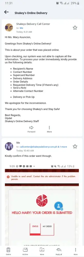 This is such a hilarious service of shakeys.! I will send screenshots for your reference. Note: I received an email from your call center telling me that they have not captured the recepient details around 9:21am.. And read your email 10:40am since I dont usually open my email. You could have called me to reach out asap! But you never did. What if I have not check on my email. Please do investigate about this! Very disappoiting bad experience from you.