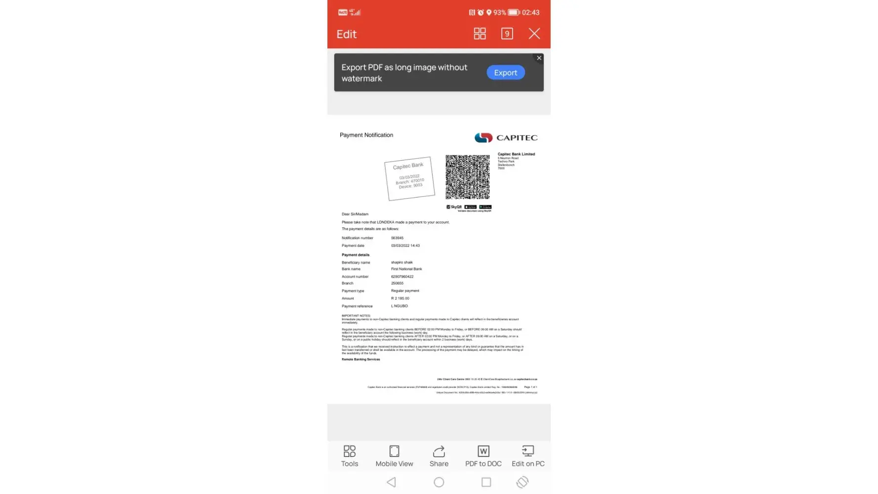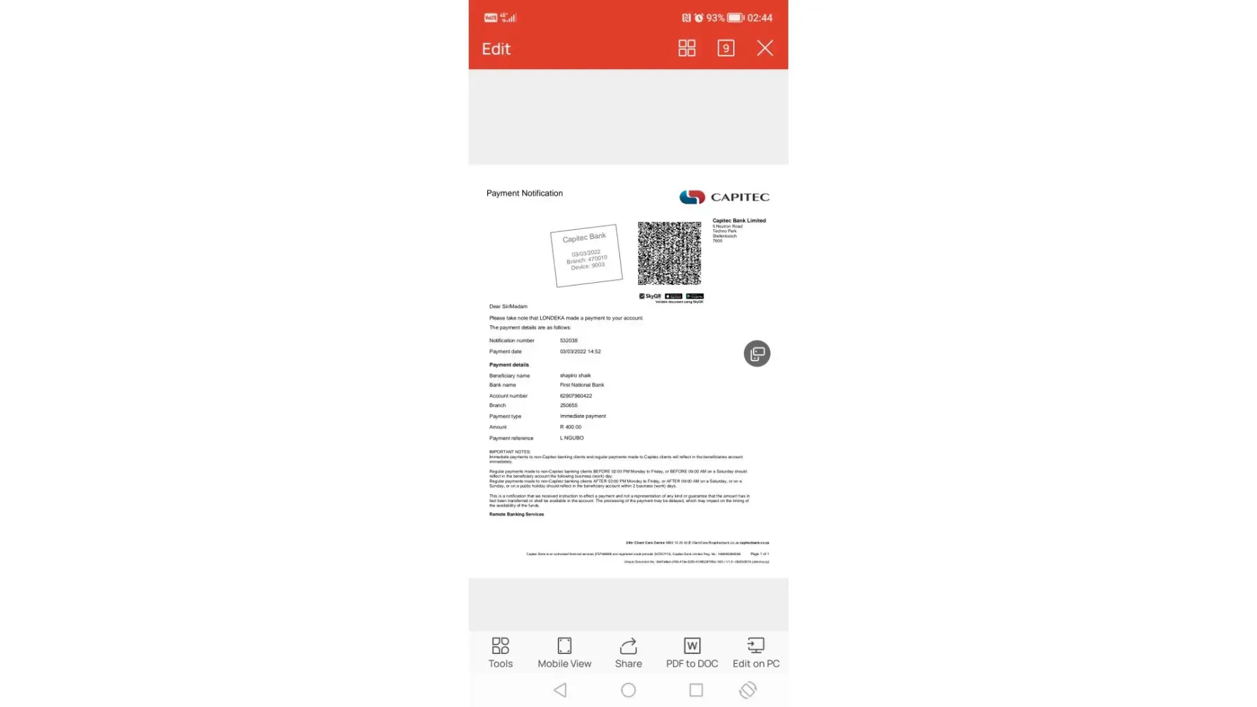 Paid up letter for cellc