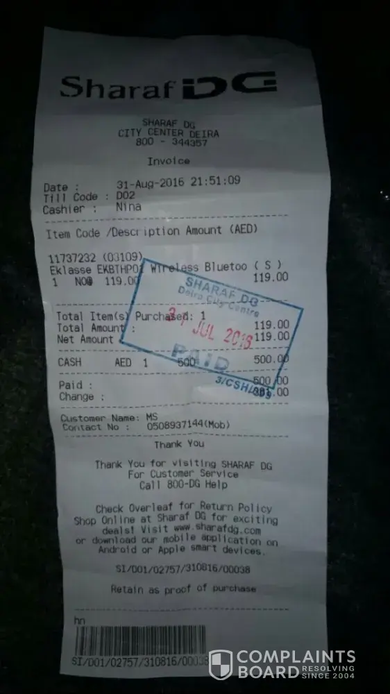 But after 1 week of using earphone for 20-30 minites every day it get broke same way as it was broken in store by sales assistante right infront of me. 17 of septenber I went to sharaf dg to return it back and they said to me that : "earphone are damaged and this is not fault of sharaf dg so they can't take it back'. I tell them the word of sales assistant that they can change it or return me my money. They said" it's lie but they need to confirm with sales assistant and if what he said to me it's truth they will give my money back'. They said they will call me back when sails assistan will come on the duty after couple of hours. But till today I didn't resive any calls from sharaf dg.