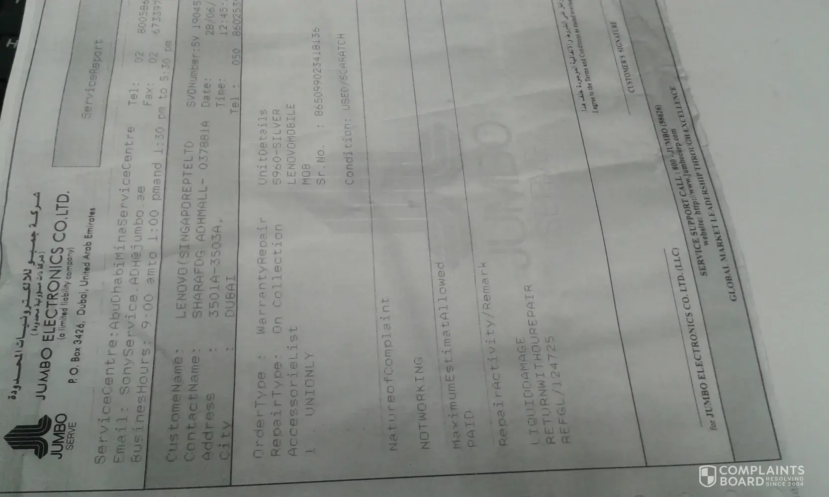 Sr. No : [protected], It was repaired on last month and surrendered to customer care in Abu Dhabi mall branch on 24/6/15. Service Request Number : SER/037881/2015.
