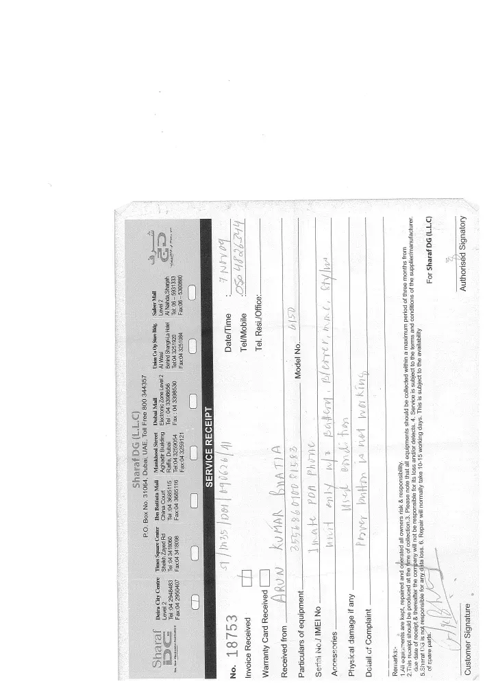 My service receipt no 18753 dated 7 nov 2009.