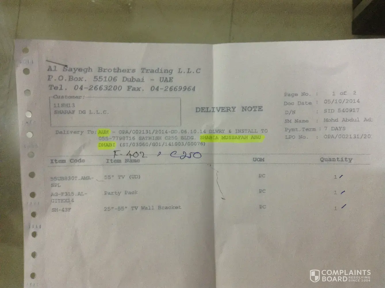 On 7th Jan 15, again no reply. Then, I again called back to customer care then they said they will pass my concern to Dubai Mall branch. After 2 hours, I received a call from a courier guy stating that he has a LED TV to deliver me. I asked him regarding TV installation and samsung soundless audio bar. He replied that he can’t install TV because he is just a courier boy and he has only LED TV to deliver.