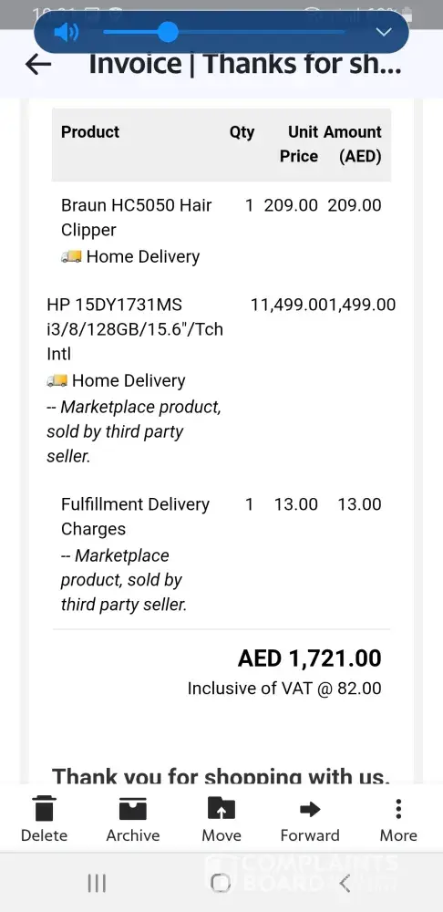 Vide your Order No. W1269895 dated [protected], I purchased a Gents Moser Hair Clipper for AED 323.00 (including AED 13 Delivery Charges). It was to be deliveered by [protected]. I followed up on [protected] as well as on 4-6-2020 but was told that they ill raise the complaint. I was provided no reason why it was not delivered and when will it be delivered. I was also told that it is available in stock. If there is no response in another 24 hours, I will lodge this complaint with Consumer Protection Department of Dubai Government.