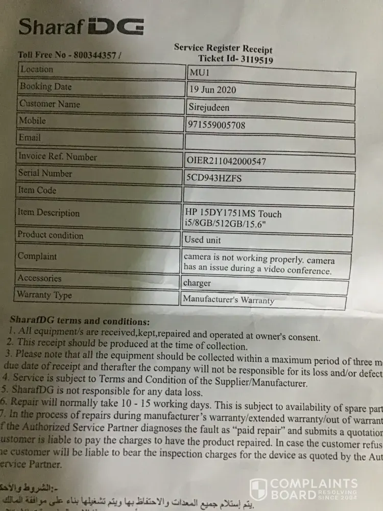 Initially we submitted to TSq service centre and after 1 week someone informed us that part is not available and checking with supplier. Later the technician calls up and says it is not covered under warranty and to be handed over to customer care. However now it is almost 3 weeks there is still no update or action from CC team on this issue even after sending reminders. It is a pity that a reputed brand like HP and Co like Sharaf DG is not able to provide timely service to its customers. Being a regular customer we have bought several products from you in the past and this makes us lose trust in your products and service.