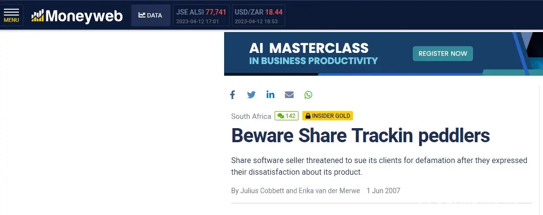ShareTrackin Scam: Avoid at All Costs! I wish I never signed up. I wish the salesperson never got my number and called me. ShareTrackin is a predatory scam that lures you with lies of effortless profits and easy money. They trapped me in a R35k loan for overpriced software, payable over 36 months, PLUS a 24-month subscription which adds to a total costing...