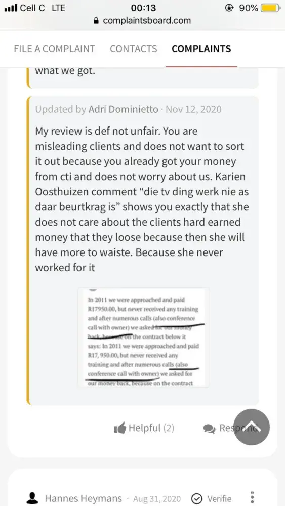 CT-International het my weer gekontak vir hulle geld waarna ek weereens aan hulle verduidelik het dat ek die kanselasie deurgestuur het en dit self vir hulle aangestuur om te sien.