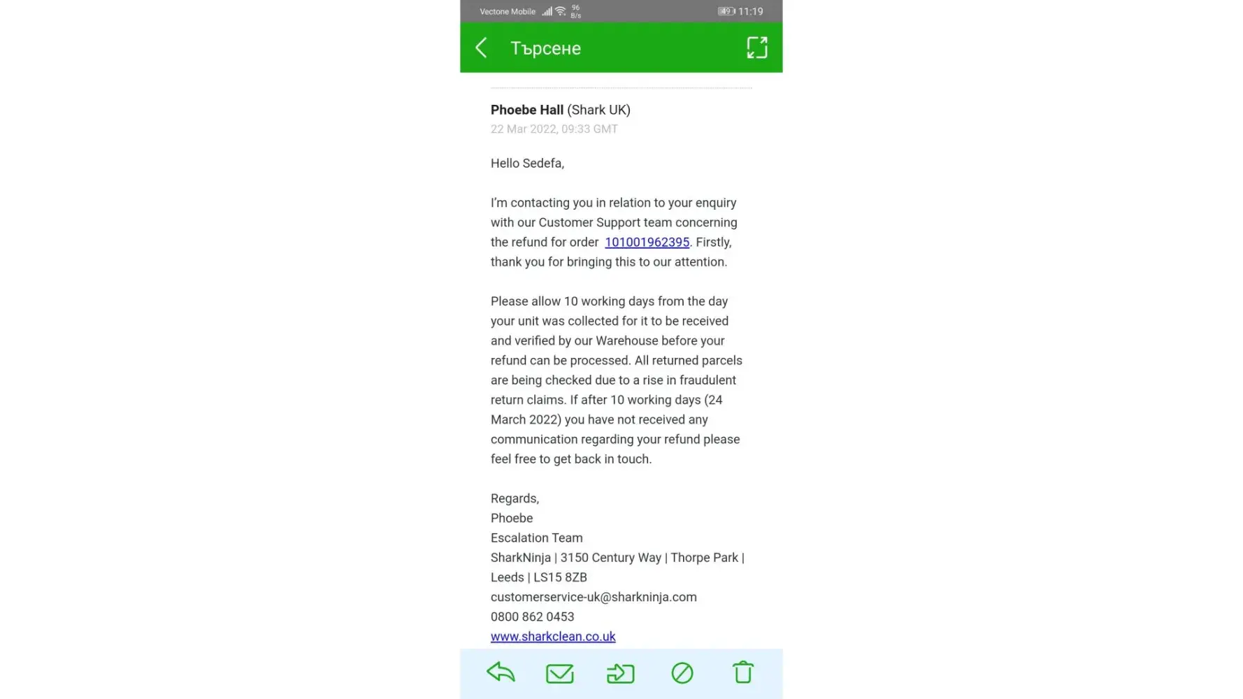 Returned the vacuum which was delivered to them on March 9th, 2022 (shows delivered), called them after 1 week, and Shark customer service confirmed the receipt of the vacuum and said the refund will be issued within 10 days. It's been over 3 weeks since the last call to them and they have still not issued the refund.