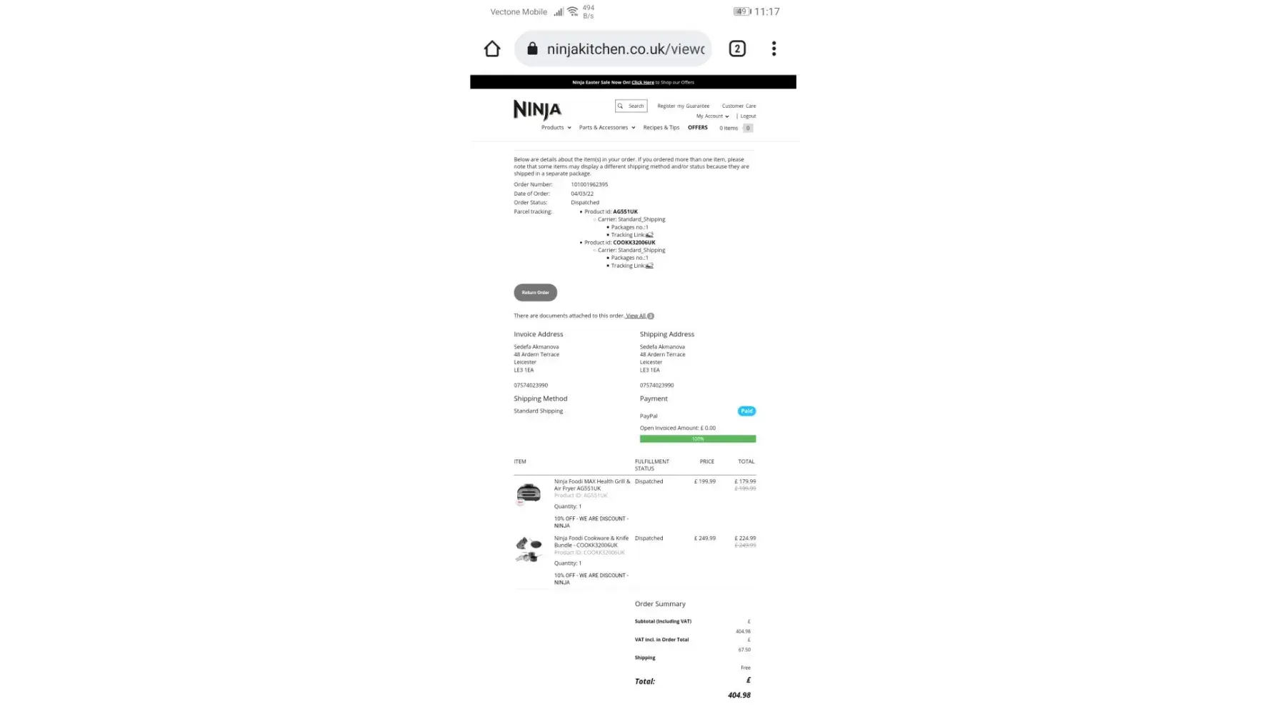 Dear Sir / Madam, I am writing to you to raise an issue about: Online shopping The issue that I have experienced was: I ordered on 4th March a Ninja product And on 5th I recieved it and contact customer service to return one of 2 items which was The grill. I recieved a list woth shops where I can drop it And start going around to all as they declined to...