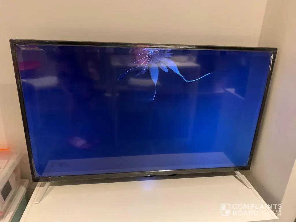 My brand new only two months old sharp 49inch tv got a little crack in the bottom of it from my 2 year old throwing his plastic bottle at it and now it has a great big thick black line running vertically through the middle of it ! I certainly won't be buying a sharp tv again unless ya can do something to help me I just paid £350 for this tv and can't afford another one as of yet ! This really should not of cracked from a plastic bottle 😩