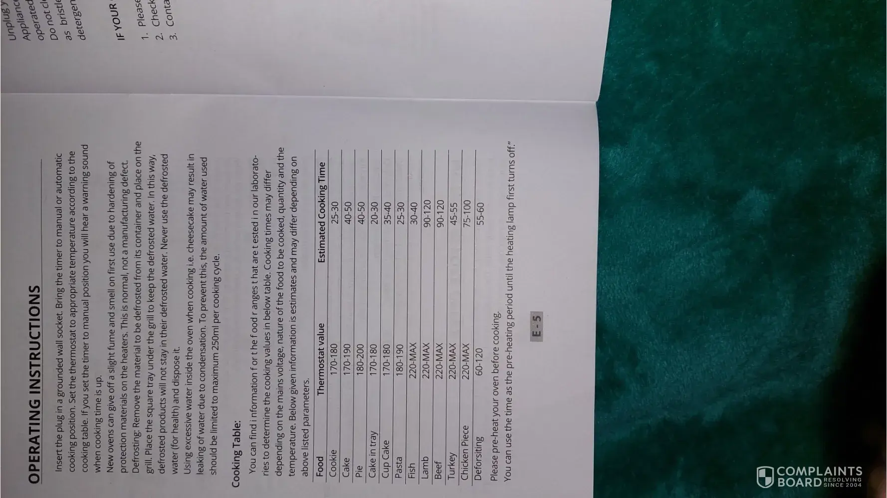 Following the operation instructions indicated in the user manual cooking table (copy attached), unfortunately, your product has not performed well. A significant lack of information is clear in the manual cooking table. Only thermostat value and estimated cooking times are indicated for the different food types. The oven rack choice and the program selection are not identified.