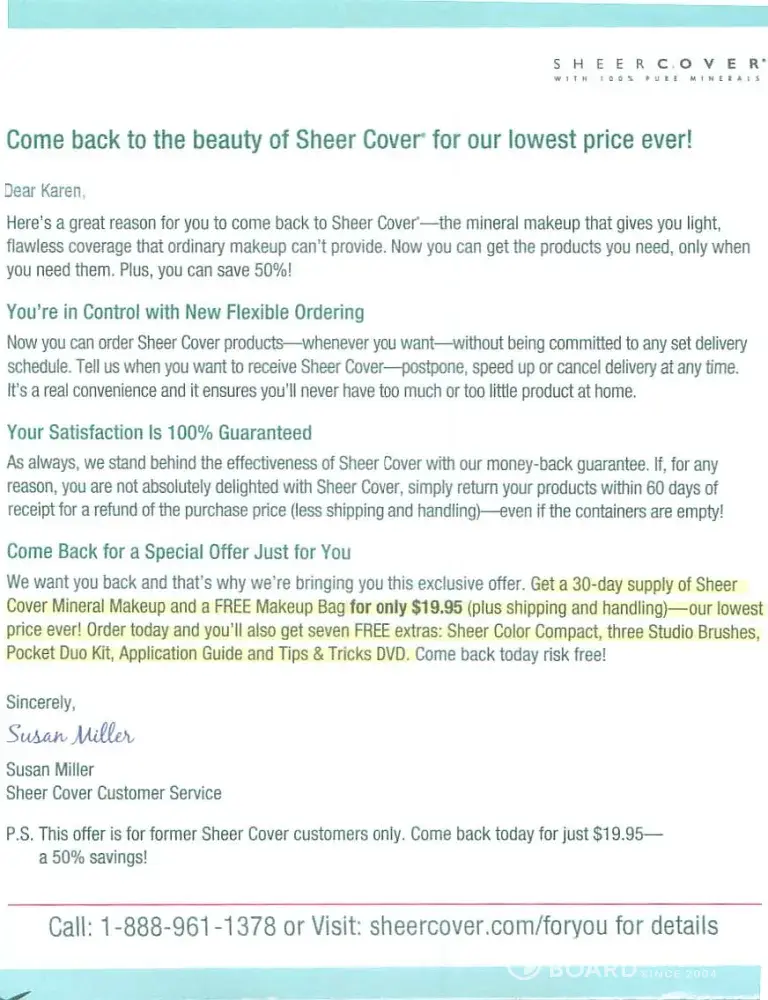 This company is horrendous and the worst customer service I have ever in my life encountered. One person would tell you one thing, and the next time you call you get an entirely different story. Never again will I ever purchase Sheer Cover and I am telling everyone I know not to buy because of the poor customer service, operate, and continue to take money they are not due.