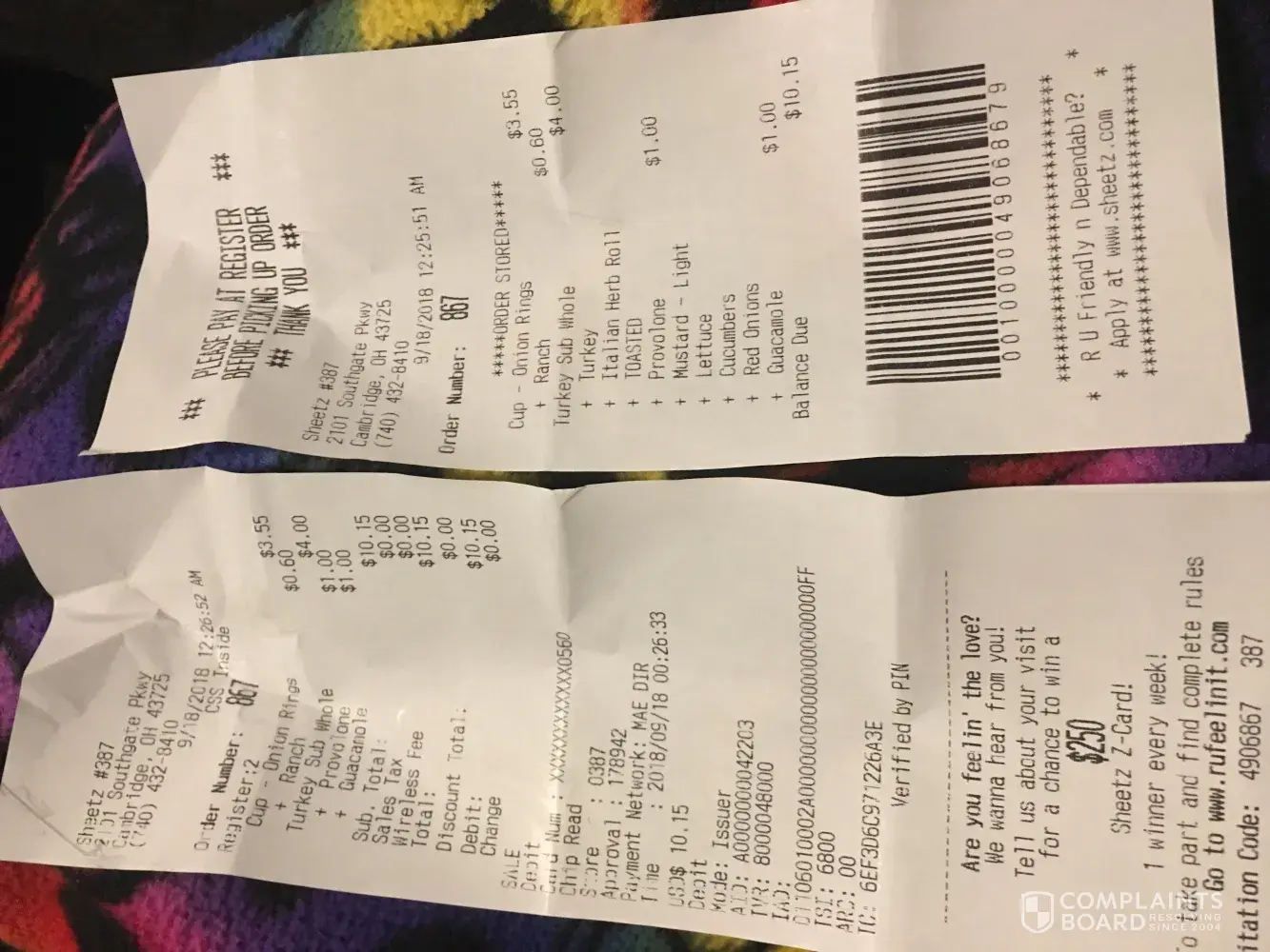 For the sake of getting 350 or more characters... I downloaded the Sheetz app and ordered for a specific time (5:00 p.m.). When I got to the Sheetz in Rostraver, my food was already done way ahead of time and was cold. Also the order was wrong. I ordered 3 snack wraps and got only 2 snack wraps. Also the turkey sandwich was wrong. Lastly, I ordered iced coffee and it was made way too early and watered down. I am very very disappointed.