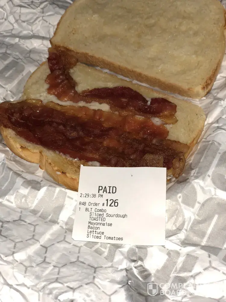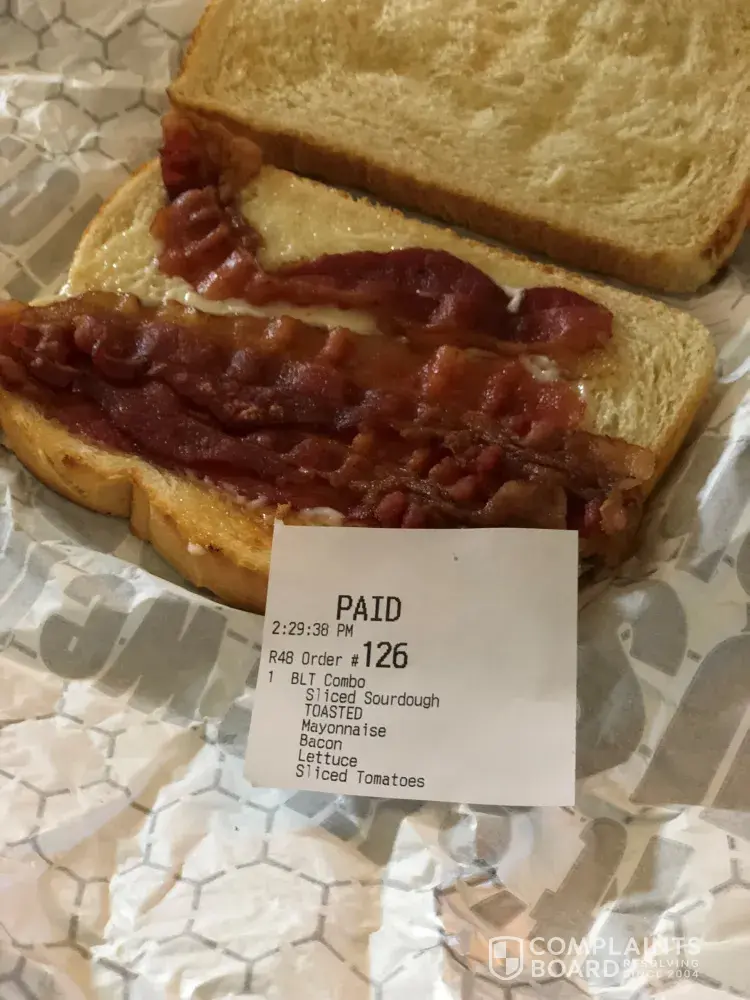 I ordered a BLT sandwich at Sheetz Store #14. When I got home and unwrapped my sandwich I had a bacon sandwich. My sandwich was made with bread, mayo and bacon. I've attached a picture of the order slip that clearly states lettuce and sliced tomatoes. I called the store and they said I can come back but its clearly an inconvenience and should not have to be done. I don't understand how you can miss the main ingredients of this sandwich. I can understand if you miss one of the three but two miss two of them I cant understand.