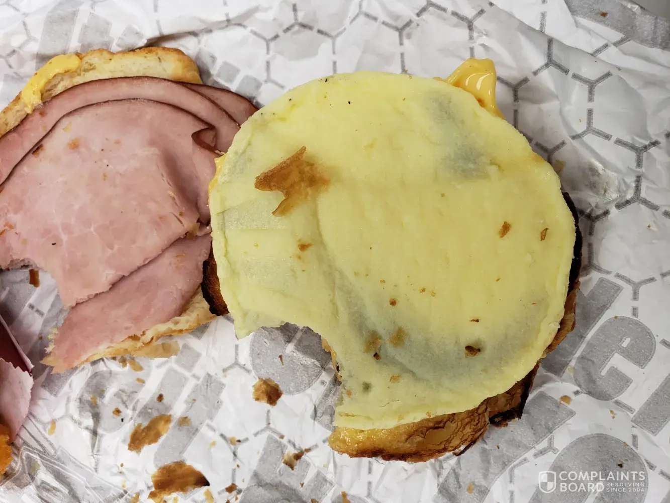 I ordered my usual croissant ham, egg and cheese breakfast this morning 9/28/18. But this morning I took a bite of my sandwich and it just didn't taste quite right. I pulled the top half of my sandwich off to take a look and there were 3 mold spots on my scrambled egg. I was completely disgusted, but mainly disappointed and I couldn't take the sandwich back I tossed it into the garbage.