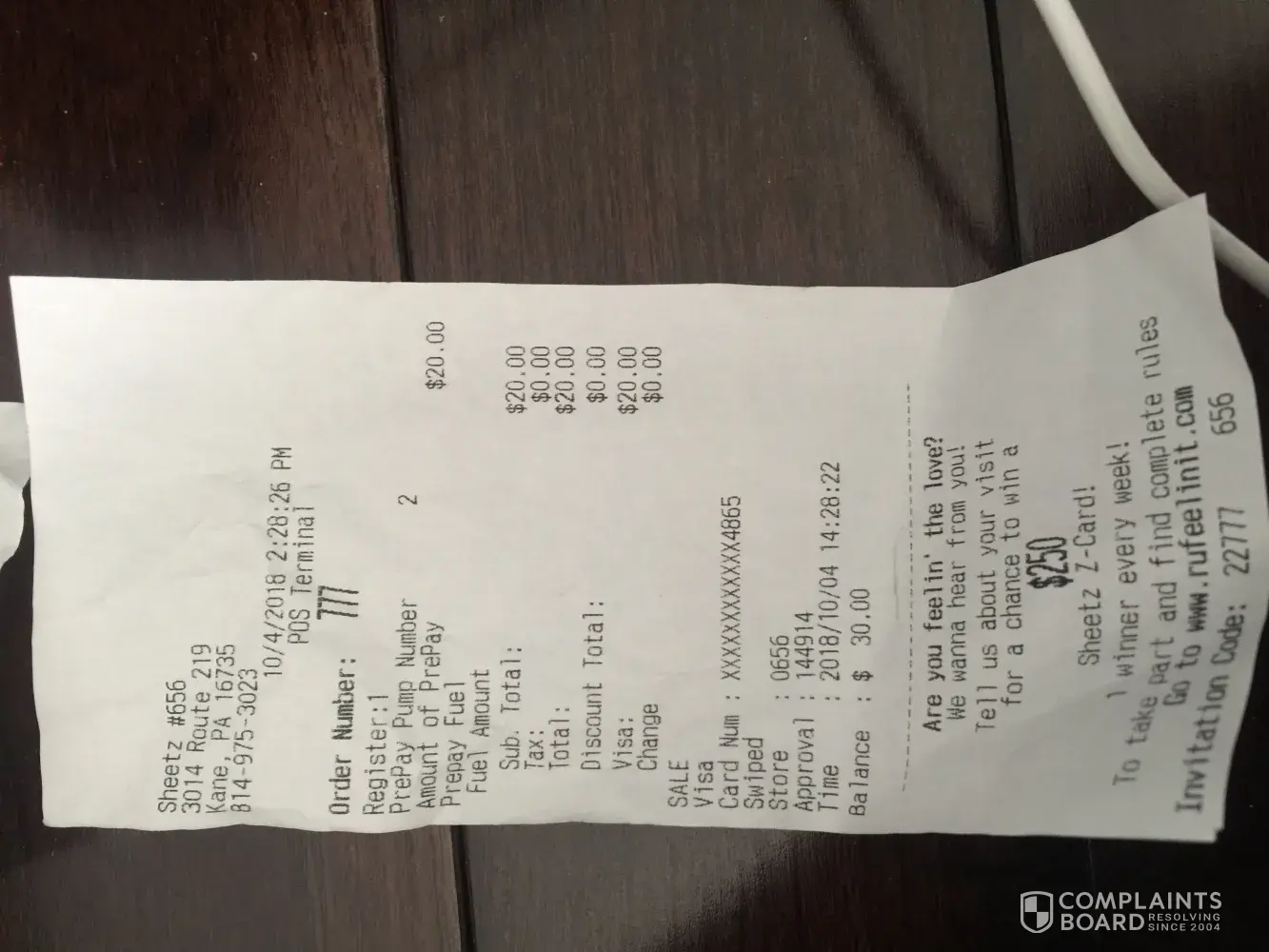 Ask any of the representatives at the Sheetz there at around early afternoon time on October 4 yesterday, they will tell you I waited for about half hour or more to get my gift card that I purchased from that same store to go through for then purchase of 20 dollar store of gad I needed. I was Late to my international meeting in Canada as a result. I need compensation for what happened. Please provide me he 20 dollars as a free gas tank fill up and also a free 20 dollars additional sheetz gift card, totaling 40 dollars. You can write me a check For the first twenty. Your system was down and it wasted a lot of my time. Call me so I can give you my mailing address. Look st attachment bere for picures of THen receipt! I am also taking this up with the be bBB and the states attorney generals office of PA in their consumer division.
