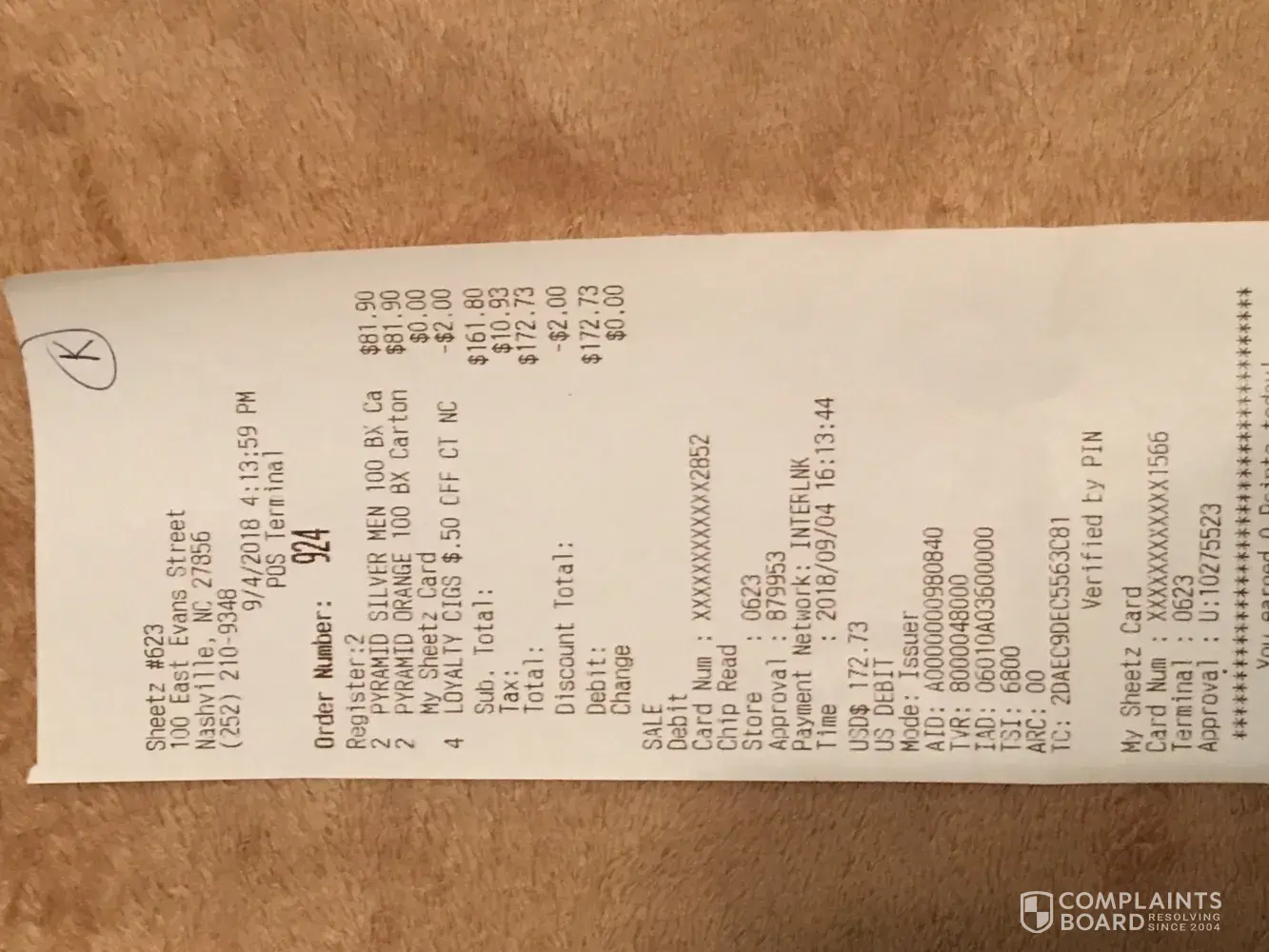 My name is Karen Wallace, I purchased two cartons of pyramid orange and two cartons of pyramid menthol 100 cigarettes yesterday after work 9/4/2018, 4:13 pm at store # 623 Nashville NC. When I got home, my boyfriend opened one of his orange cartons, and one pack was missing- the end of his carton that one was missing had been taped. He took pictures. When I got home today, I opened one of my Menthol cartons, one was missing from it- mine had no tape but was glued on opposite end. You have a employee stealing packs from various cartons, that person's gain, but my LOSS. Please advise as to how I'm to handle this.