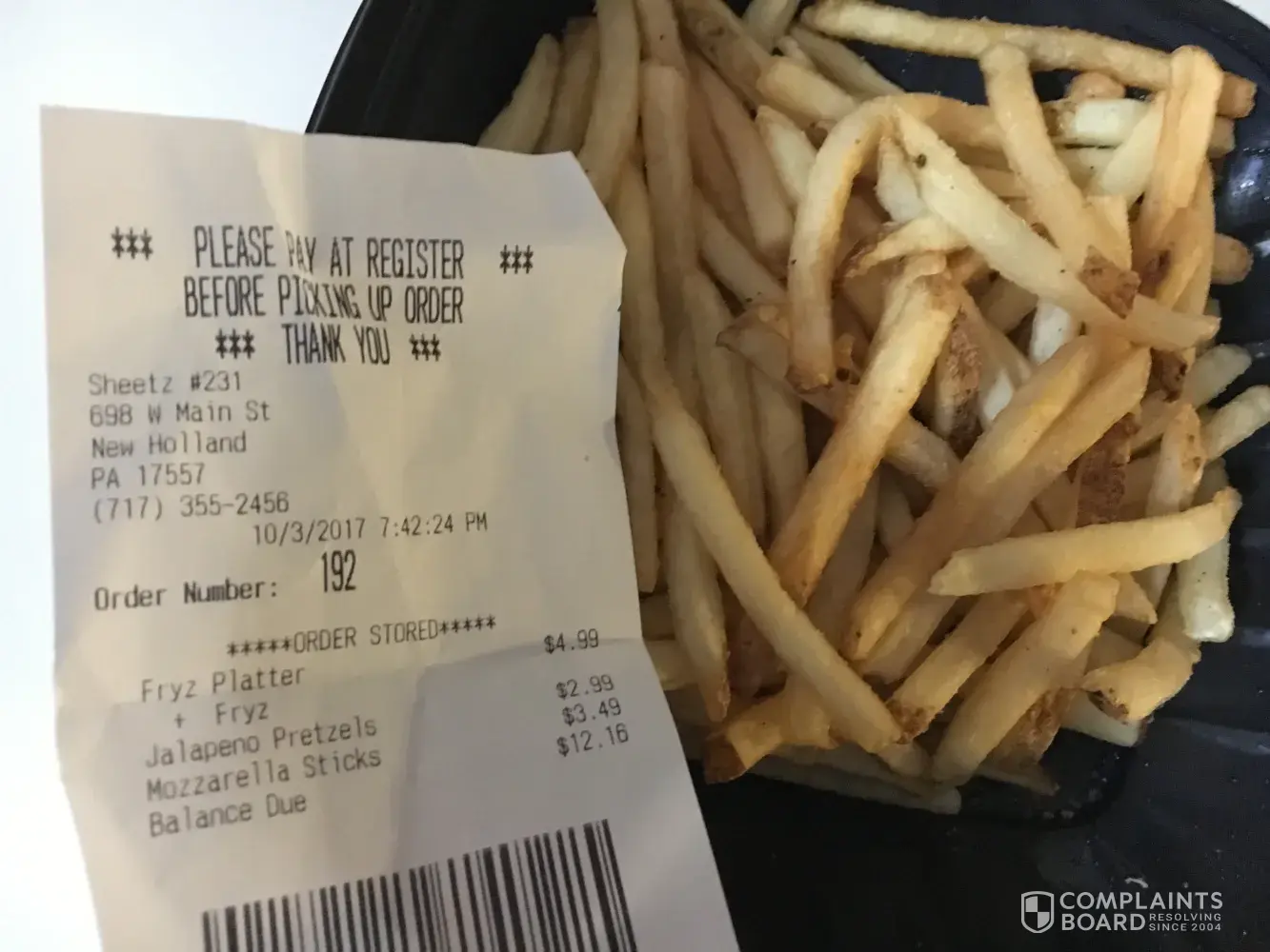 Hello my names chris I ordered a fryz platter which is my favorite. But when I got home it was just fryz with nothing on them, I was sadly disappointed. This isn't a first for me as it use to happen to me in Lancaster a lot. Also they never gave me marinara sauce for my pretzel. My wife was not happy at all.. I hope these issues can get resolved and my orders don't continue to get messed up as I will be checking everytime after I get my food now. Thank you for your time.