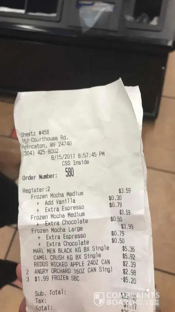 On August 15 around 8:50pm me and my friend decided to go to Sheetz on Court house road in Princeton WV store #458 (which I'm a very regular customer at) to get cigarettes and coffee and not only did we encounter rude service, but the person in line in front of me dropped their 22oz Glass bottle Budweiser on the floor resulting in glass shards in my foot and toe. I'm usually one to over look an accident, but the manager refused to let another store employee attend to the mess and left the beer and the shattered glass on the floor and just threw up a wet floor sign due to being short staffed. Not only did they not clean up the mess, but they also failed to even ask if I was okay. The manager also, was very rude towards her fellow employees by rushing them while I was asking the employee a question about my order. I am very unsatisfied with the service and the experience I encountered tonight.
