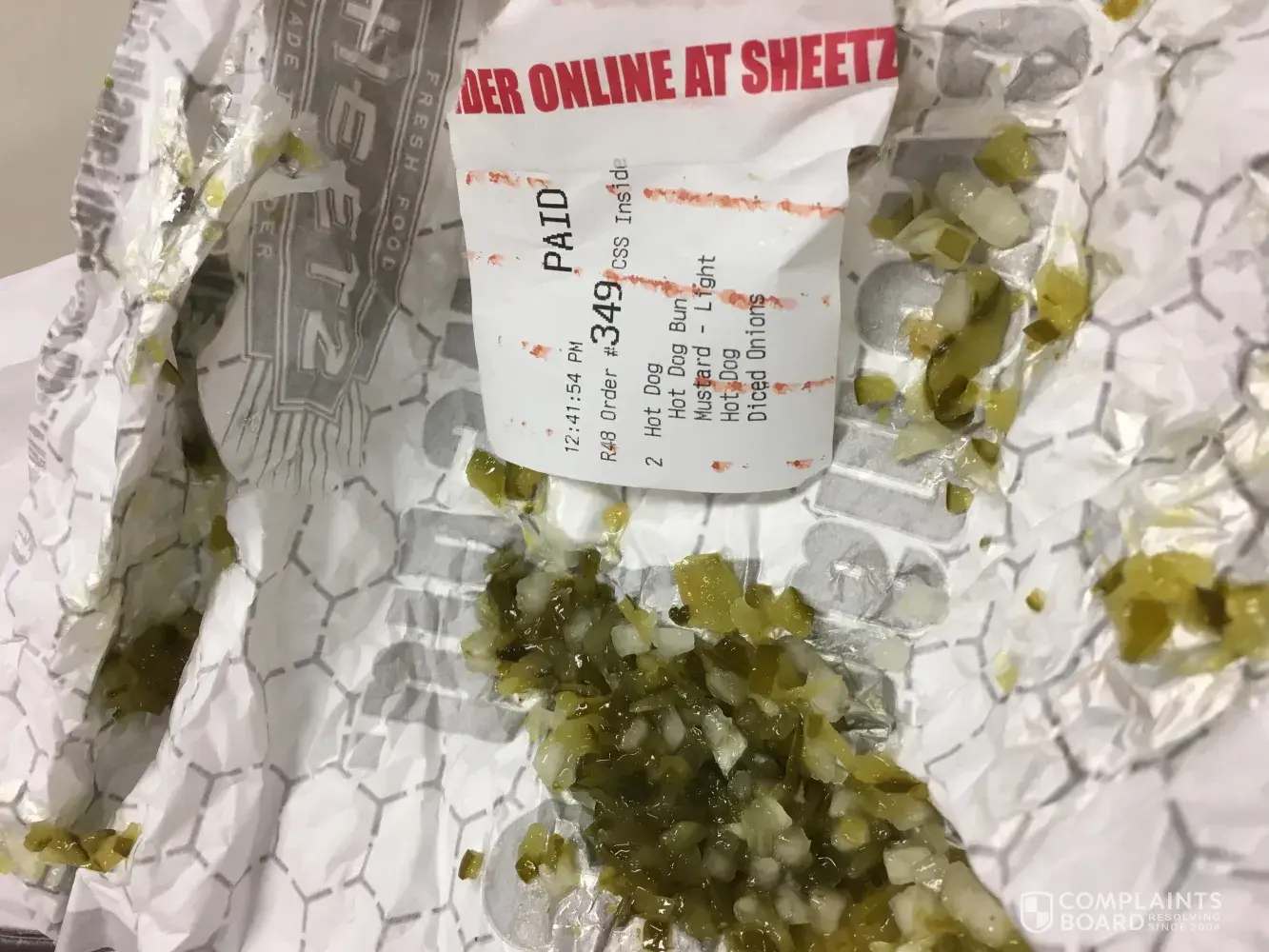 Today I went in and ordered two hot dogs for lunch. When I got back to the office, I opened them and found that they had relish on them. My slip and the tag on the hot dogs did not say to add relish to them. I did not have time to go back and have them fixed so I had to scrap off the relish and onions. I wanted the onions but since they were mixed with relish I had to take it off. I was not happy that my lunch was ruined. I took a picture of the relish and of the tag.