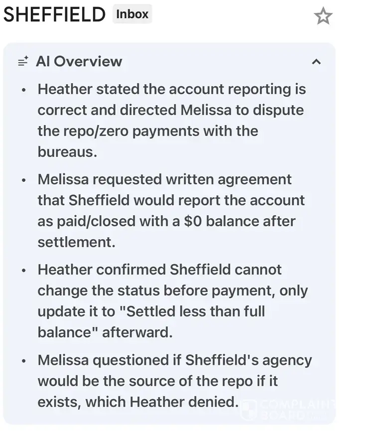 Sheffield Financial is reporting inaccurate and inconsistent information to the credit bureaus regarding my account. Sheffield has stated in writing that they are not reporting a repossession, yet my credit reports show severe negative reporting including a charge-off and incorrect payment history. Sheffield has also refused to provide written confirmation...
