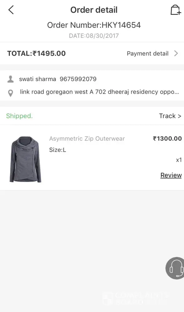 I have ordered asymmetric zip outerwear from shein on 30 august, 2017 but till now I didn't get the product. And it's showing in the middle of somewhere in Hong Kong and it's been 4 days it's still showing the same. My friend ordered another item the next day at the same address and she got it and here I'm still waiting. My order id is HKY14654. I hate this company. First experience is so worse