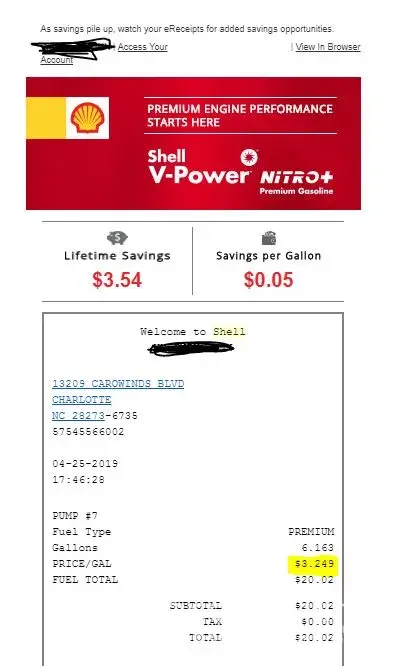 I was at a local gas station here in Charlotte, NC. I pulled into the gas station and the pump read 2.69 for premium. I thought to myself this is awesome. I put a total of 20.02 in my tank. I requested a printed receipt at the pump, however it did not print. I went inside and requested a printed receipt. I even mentioned to the associate how low the...