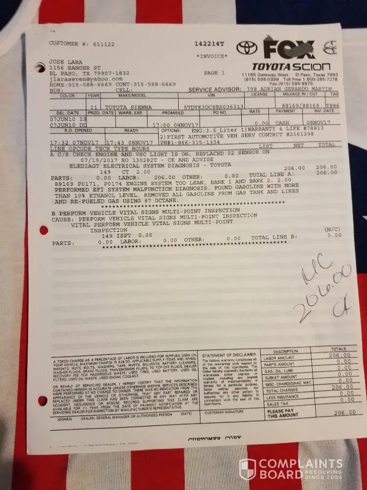 I had gassed up on the two following dates 11/2/2017 and 11/16/2017and again 07/21/2018. Upon driving the vehicle I had a Toyota Sienna computer lighted up "check engine" light and "VSC" light. I decided to get it to the dealership Fox Toyota Scion to fix the problem. Upon diagnosis Toyota discovered that the malfunction issue was due to gasoline (Shell Giant) with more than 10 % ethanol level. Toyota Scion had to remove all gasoline from gas tank and lines. They had to refuel gas using 87 octane. I am sending all information to confirm my Sienna Toyota issue. I am requesting the reimbursement of the repair which is $206.00 dollars.