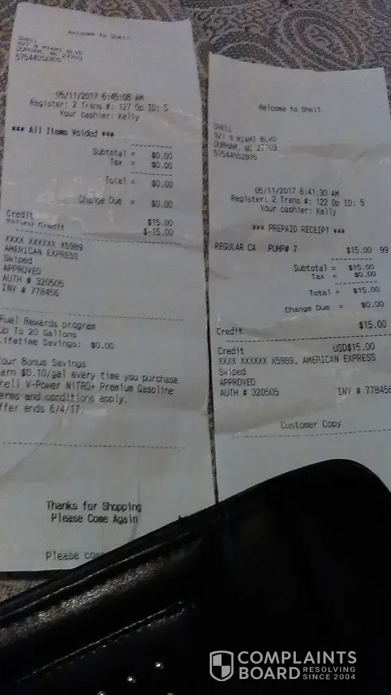 I went to the gas station on 921 North Miami Boulevard Durham North Carolina on May 11th 2017 the employee had to void it out because my rewards fuel card didn't go through the first time. So he credited my $15 from the first transaction and then charge my card another $15. But the first $15 still haven't came back to my card yet. So when I called back today May 16th 2017 two find out what the problem is. He tells me the only takes 24 to 48 hours. So now I'm like why I haven't got my money back yet. So I call all the Shell stations some told me you can get it back the same day some Told Me 2 to 3 weeks my question is when will I get my money back