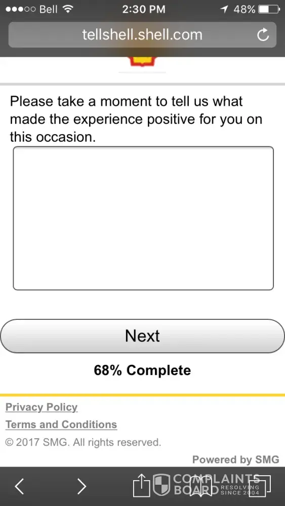 I fill out survey every time I go to a shell gas station which is every time I put gas in my car. Today I tried filling out the survey twice, and both times I got to the part tell us how this experience could have been improved. (68%) and before it sends me to the page to fill out if I bought unleaded or diesel, it brings me to another page thanking me! I was not able to fill out info for the contest, maybe one of those two shots was my winning survey!