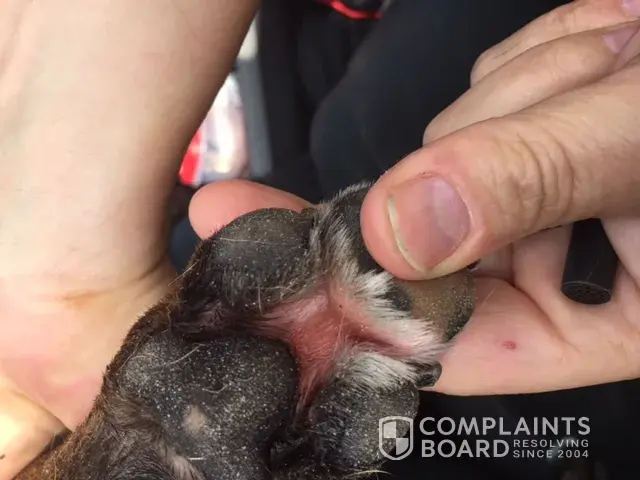 Almost immediately, my dog became highly agitated, jumping around in the truck. I thought it was because she didn’t have the opportunity to actually use the break, so I told my fiancé who had pulled up next to me, I would return to the grass. As soon as Bella, jumped out, she began to repeatedly drag herself on the grass in circles. My fiancé was pulling towards a pump when I called him to come help me with the dog, because she was clearly in distress. We used the first hose we saw at the motel to irrigate her paws, to no avail.