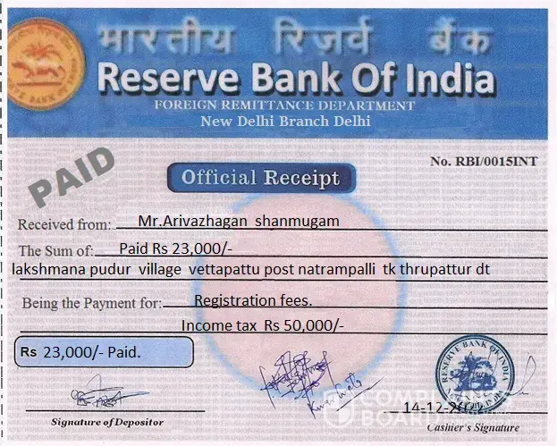 me arivazhagan shanmugam will pay rbi registration fees pay recipet in ,,Rs ,23,000 thousands