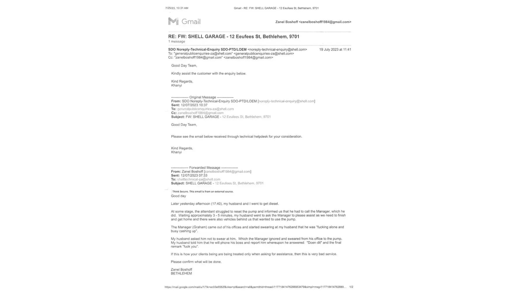 He attacked me in the store. And threatend my life . Tackled me into the cement wall. I was afraid for my life. Given the fact he's twice my weight and size. I feel a law suit is necessary against Shell due to the fact it was on shell property. By a Shell worker. Wearing a Shell uniform.