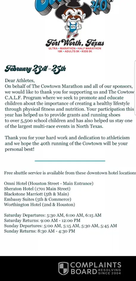 My wife and friends are going to the Cowtown Marithon in Fort Worth, TX today. The website showed that the shuttle was running from the Sheraton to the race. I called to make sure what time the shuttle was going to run and they said it was not. It was out of their 2 mile radius. I told them about what the site said and that is why we chose to stay there.. she then hung up on me. I called back and spoke to a supervisor and she stated the same thing. I believe they had the shuttle posted to get people to stay and never intended to run it. We will not be staying at a Sheraton or any other hotel in the chain. Very frustrating!