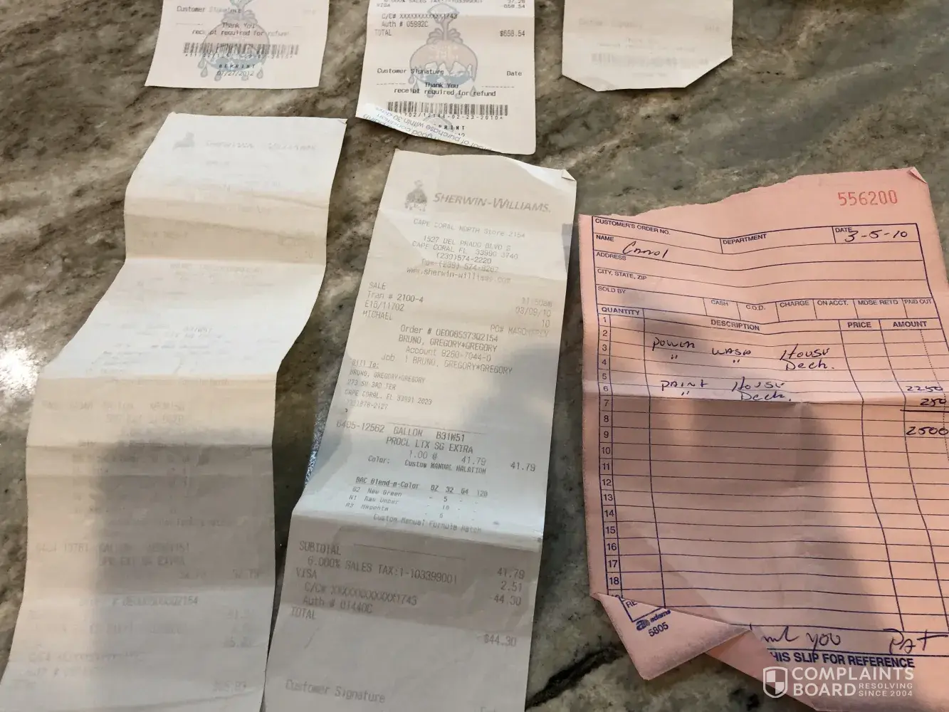 I am writing to you as a disgusted customer. I went to your store at 1262 SW 4 St Cape Coral Fl. Talk manger with all my receipts since I bought it at another store he said manager and sales representative will call and look at my house well only sales representative showed up Steve Crawford. The paint was peeling so he took pieces off and took lab. I...