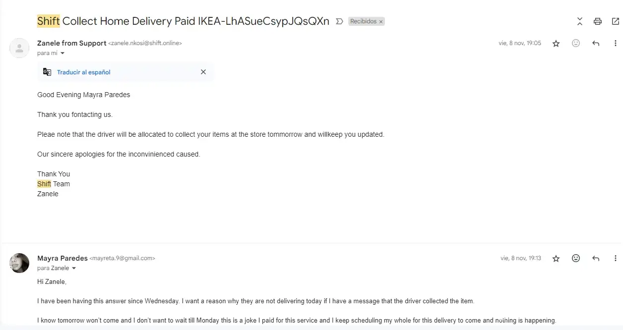 The email communication with the Shift.Online representative.