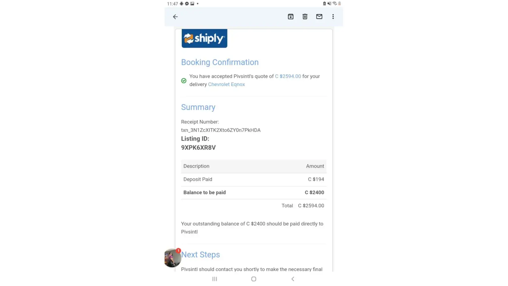 I placed an ad on shiply. A company by the name pivsinl qouted it. I accepted that qoute, paid for that qoute and been waiting for my suv for 4 months. All I get is fake date on when I should have it. This has been since April 2023 and is undoing still. I lost work,which means I lost money. The guy I speak to tells me he is bringing it one minute next minute it's in New Brunswick. The guy goes by the name Alex. I emailed the company many times to no response.